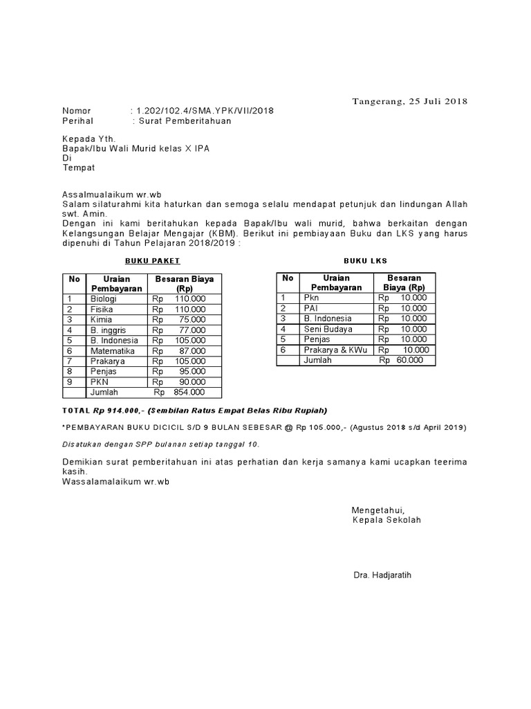 Contoh Surat Pemberitahuan Pembayaran Sekolah Untuk Wali