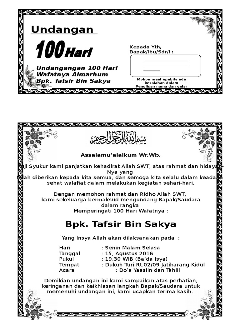 Undangan Tahlilan 100 Hari Meninggalnya Doc Document