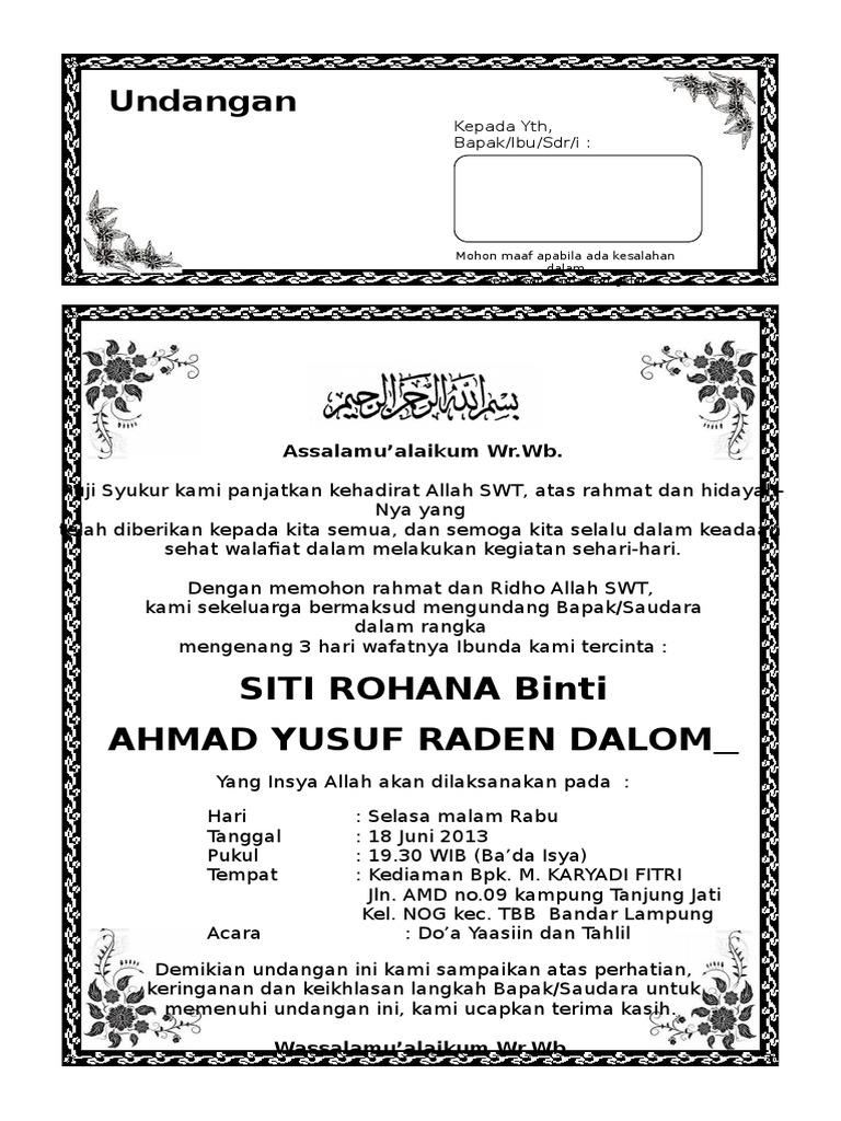 Undangan Tahlil 40 Hari Dinata Microsoft Microsoft Word